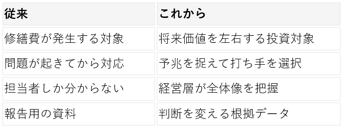 といった経営判断に直結する問いには、即座に答えられないケースが少なくありません。原因は明確です。施設に関する情報が「経営の言葉」に翻訳されていないからです